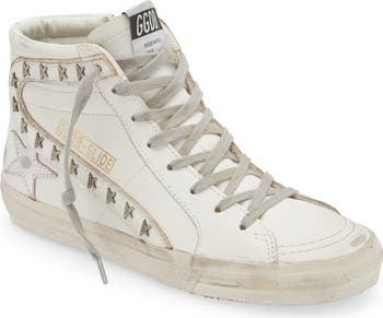 Incomplete star studs shine against the leathery upper of an easy-on high-top sneaker that has a downtown vibe with signature distressed detailing.