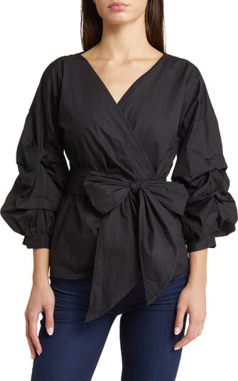 This tie-waist poplin top is designed in a wrapped silhouette with voluminous sleeves.