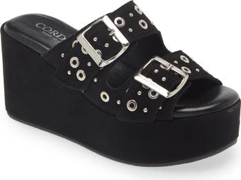 Gleaming grommets and adjustable vamp straps lend visual intrigue to a retro-cool slide sandal lifted by a cork-wrapped platform and wedge heel.