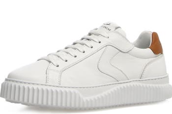 A colorblock heel wrap adds interested to a low-cut sneaker fashioned from fine leather with a stylishly grooved midsole.
