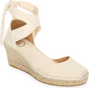Layers of braided jute wrap the gently sloping sole of an espadrille wedge that winds above the ankle and finishes with a sweet bow.