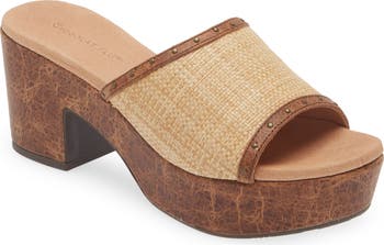 Woven raffia keeps your summery look chic in a classic slide sandal set on a platform block heel.