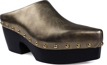 Polished rivets highlight the pointy toe and bold platform sole of a burnished leather mule that brings together retro and modern influences with ease.