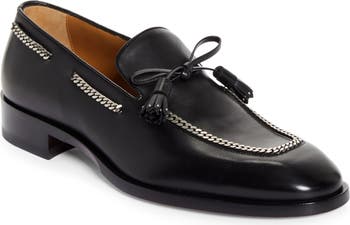 A shining curb chain traces the clean-lined silhouette of a calfskin-leather loafer that's set on a signature Loubi-red sole.