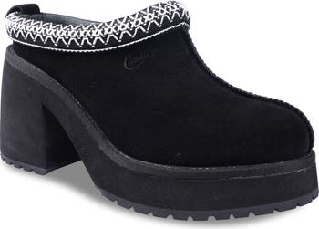 An embroidered cuff lends free-spirited style to a supple suede clog situated on a chunky platform sole.
