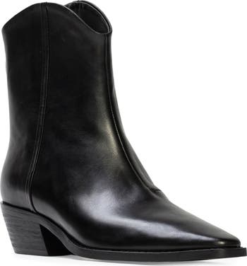 A curved topline adds Western-inspired styling to a luxe boot balanced by a pointy toe and stacked block heel.