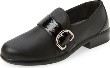 A gleaming buckle highlights a plain-toe loafer designed to cushion every step with an arch-supporting insole and slip-resistant sole.