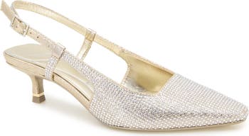 Tonal embellishments sparkle and shine on a glamorous slingback pump balanced by a slender toe and kitten heel.