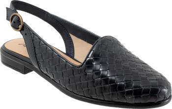 A woven leather upper adds textural intrigue to a luxe flat fashioned with an adjustable slingback strap for a secure fit.