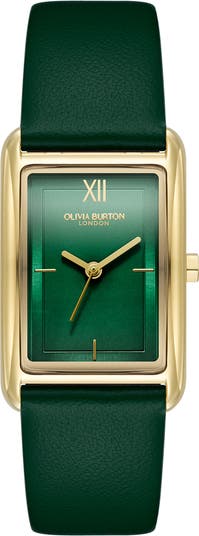 A minimalist dial adds streamlined elegance to a slim rectangular watch set on a rich leather strap for luxe appeal.