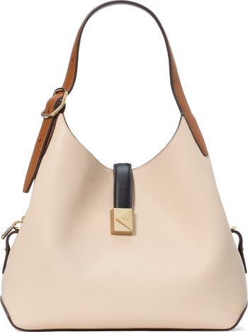 Signature logo hardware and pebbled leather distinguish a luxe shoulder bag furnished with a divided interior for optimal organization.