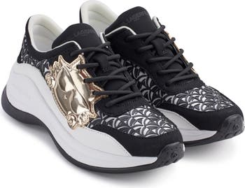 A logo appliqué gleams atop a street-chic sneaker lifted by a chunky contrast sole.