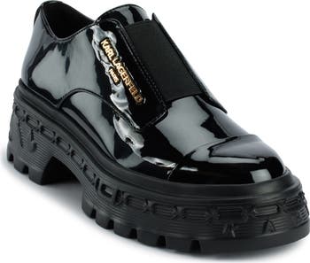 Subtle logo motifs elevate the look of a street-chic lug-sole loafer with a glossy patent finish.