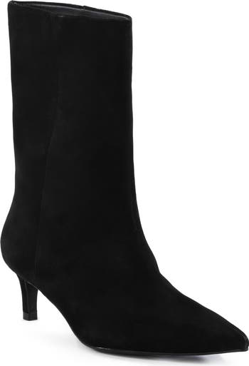 A pointy toe and kitten heel balance a luxe bootie set on a cushioned footbed for comfortable wear.