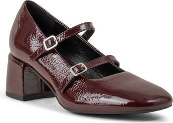 Adjustable mary jane straps add a retro aesthetic to a glossy naplak-leather pump balanced by a square toe and wrapped block heel.