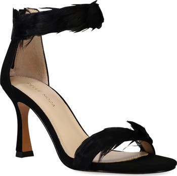 Fanciful feather trim highlights the ankle strap of a lofty sandal that completes your look with modern finesse.