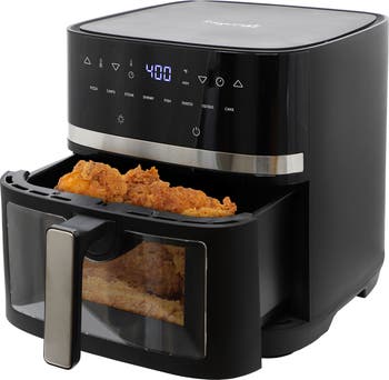 Introducing the MegaChef 8.5 Quart Digital Air Fryer, designed to revolutionize your kitchen with its blend of advanced features and sleek aesthetics. Operating at 120V/60Hz with 1700 watts of power, this air fryer offers efficient and consistent cooking performance. The spacious 8.5 Quart capacity allows you to prepare larger quantities of food, making it ideal for families and entertaining. With an adjustable temperature range from 175 to 400 degrees and a 60-minute timer, you have precise control over your cooking process. The LED display with intuitive words simplifies operation, while the transparent window lets you monitor your food without opening the basket.Crafted in a sophisticated black and stainless steel finish, the MegaChef Air Fryer combines style with functionality. It includes essential features such as a safety switch that turns off the unit when the pan is pulled out, a cold touch handle for safe handling, and non-slip feet for stability. The air fryer also boasts dishwasher-safe parts for easy cleanup, an automatic shut-off with a ready alert for added convenience, and a heating indicator to keep you informed. Enjoy healthier meals with less oil, thanks to the air frying technology that delivers crisp and delicious results every time. The MegaChef 8.5 Quart Digital Air Fryer is your go-to appliance for fast, efficient, and healthier cooking.