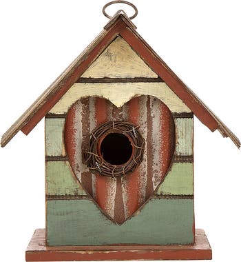 This distinctive Valentine's cottage-inspired decorative birdhouse is handcrafted from solid wood with a retro palette and distressed details, featuring a layered heart shaped window. This charming design can not only provide a safe and sweet home for your small feathered friends but also adds seasonal cheer to transform your garden, patio, backyard, or any other outdoor space into a delightful and inviting ambiance!