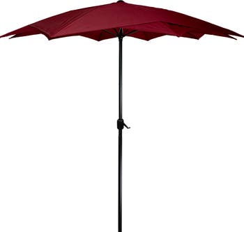 Stay away from the sun's hotness with this richly colored patio lotus umbrella. Comprising a sturdy, powder-coated aluminum frame with fiberglass ribs, this tall, modern-style umbrella is built to last a lifetime. The crank opening enables easy use and offers perfect coverage for a table and chairs. Product Features: Umbrella shape: lotus Canopy color: burgundy Frame and pole color: brown Unique "lotus" shape is achieved by layering one 5-point star shape on another for a total of 10 points around One layer is attached to the other with color-coordinated ribbon Diameter of open umbrella: 8.85' Height: 8.2' Pole diameter: 1.5" (38mm) Lift: hand crank 10 ribs Material(s): 160 gram polyester canopy/powder-coated aluminum pole/fiberglass ribs Note: Umbrella only, base is not included