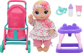 - STROLL N' SCOOT IN STYLE: This set features bright and playful colors that are sure to delight young ones. Set includes an adorable baby doll, stroller, walker and care accessories.
