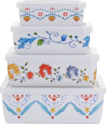 The Gibson Home 8 Piece Anaya Rectangular Nesting Food Storage Set comes with four reusable containers each with their own fresh seal lid. These rectangle shaped containers nest perfectly into each other for space saving storage when not in use. Each container has it's own unique floral design around the rim and is constructed with lightweight and durable plastic. Varied sizes allow you to store fresh fruits and veggies, leftovers, lunches, snacks, and more!