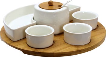 - Set includes 3 x 9oz. Ramekins, 1 x 12oz Serving Dish, 1 x 6oz. Center Canister with wood lid and spoon, 1 x wood Serving Tray