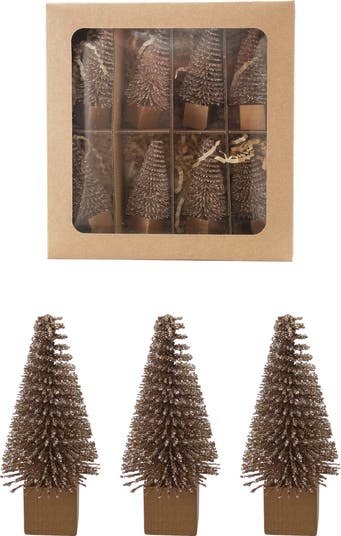- A sparkling set of eight miniature bottle brush trees finished with dazzling gold glitter, perfect for a festive touch