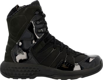 With a modern design, innovative technologies, construction, and brand name you can trust. You can't go wrong with The ROCKY® Code Blue collection. This public service shoe is constructed with a nubuck upper with TPU overlays, soft comfort collar lining, and a breathable mesh tongue. This shoes cement construction makes it light and flexible and its oil and slip resistant rubber outsole with a wider stance allows you perform in many environments without hesitation. Experience comfort in every step with our patented Comfort Tracks footbed. This combined with our Rocky Rebound EVA midsole and a fiberglass shank for added stability allows you to confidently go about your day in comfort. This shoe also features a KulKote thermal regulating lining, which helps regulate your body temperature providing a more comfortable experience. The 6mm oval laces give you a more secure fit along with a matte finish black for a stylish look, there is also a side zipper that makes it possible to get these boots on/off easily. If you need a lightweight shoe with an athletic feel and a comfortable, supportive construction, choose the ROCKY® Code Blue collection.