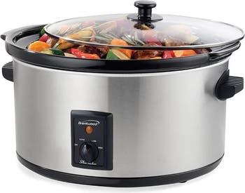 The Brentwood 8-Quart Slow Cooker offers extra-large capacity for cooking meals for gatherings or batch cooking. The stainless steel exterior provides durability and a sleek appearance, while the slow cooking function ensures tender, flavorful results over time.
