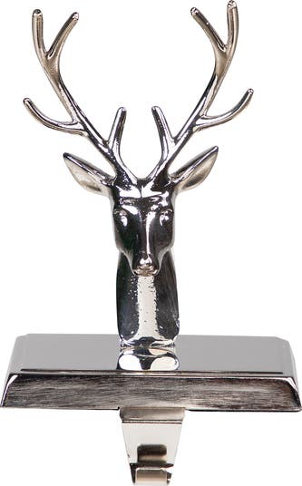 Display your Christmas stockings with a bit of glitz this holiday season with this shiny silver stocking holder. The deer sits on its shiny base and is sure to add some pizazz to your existing Christmas decor. It can be easily displayed on your mantlepiece or virtually any flat surface with an edge. This silver deer head is sure to create lasting nostalgic memories for your family! Features: Buck head stocking holder Shiny silver deer and base An 8 point buck head Weighted base for added stability while holding your stockings Metal hook in front for easy stocking hanging Dimensions: 8"H x 5"W x 4"D Material(s): metal