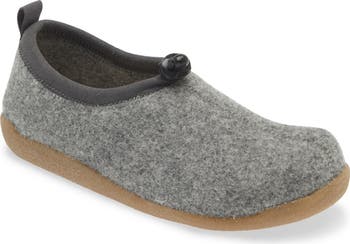 A waterproof rubber outsole provides a utilitarian finish for an arch-supporting flat made with soft and cozy wool felt.