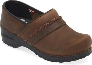 Braided trim adds subtle sophistication to an oiled leather clog that offers superior everyday comfort.