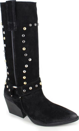 Mixed metallic studs gleam on a classic suede Western boot complete with harness hardware.
