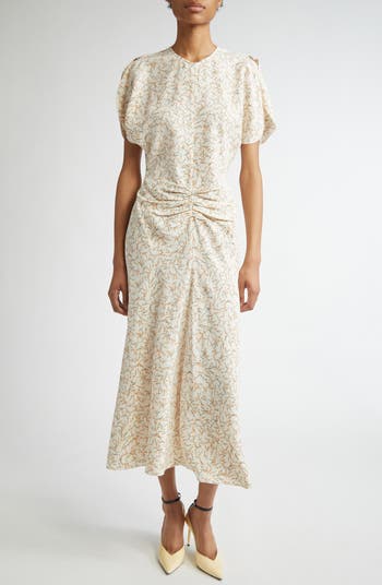 A signature silhouette from the British designer, this retro-modern midi celebrates your shape with a gathered, curved V-neck bodice and waist-defining ruching.
