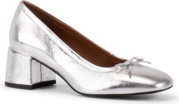 A dainty bow lends light ballerina aesthetic to a shiny metallic leather pump balanced on a walkable block heel.