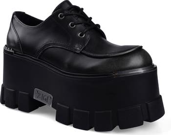 Chunky lugs put extra traction beneath a leather derby set on a sky-high platform and finished with a row of spikes at the back for added edge.