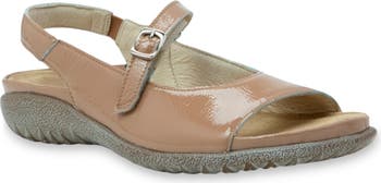 An adjustable strap with decorative buckle ensures a comfortable fit in this slingback sandal built for all-day comfort with an arch-supporting insole atop a slip-resistant sole.
