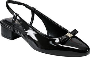 Logo-debossed hardware gleams at the center of a slim instep bow on a graceful slingback pump set on a low block heel for a stylish lift.