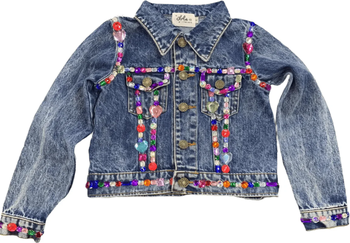 Trendy denim jacket adorned with colorful, gem-like embellishments reminiscent of jelly beans. Soft, durable denim fabric for comfortable, all-day wear. Features decorative gems on the front and sleeves, adding a playful and unique touch. Perfect for making a bold fashion statement and adding fun to any casual outfit. Runs small size up