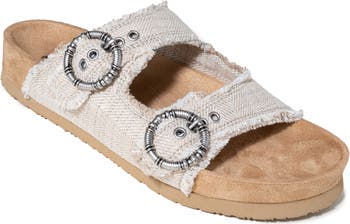 Adjustable, frayed straps offer a customizable fit in this lightweight sandal made with breathable materials perfect for warm weather.
