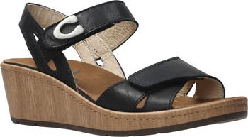 Breezy sophistication meets everyday comfort in this generously cushioned sandal set on a wood-grain wedge heel.