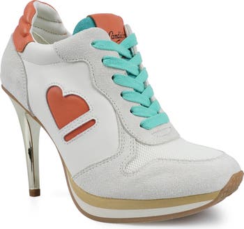 Suede overlays amplify the sporty-chic style of this lace-up pump set on a lofty stiletto heel.