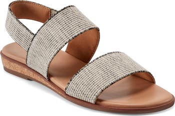 Woven straps enhance the boho vibe of a resort-ready slingback sandal fashioned with a lightly cushioned footbed and walkable flat sole.