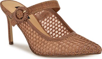 Mesh composition elevates the look of a mule-inspired pointy-toe pump set on a lofty stiletto heel.