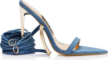This iconic line of must-have heels blends elegance with modern flair, offering the perfect statement piece for any wardrobe. The Tie Up Sandal from this collection offers a new sexy twist to the classic Rich Sandal. Thigh-high lace-up straps and unique denim fabric take this design to the next level.