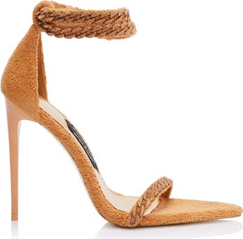 - 120 mm Stiletto Heel Terry Cloth Upper Signature Golden Sole and Insole Pointed Open Toe Design Buckle Closure Ankle Straps Diamanté Encrusted Chain Details Heel tip replacements now included!