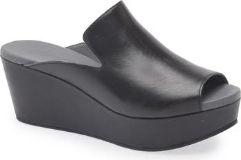 A notched leather vamp enhances the smooth lines of a peep-toe slide sandal that boosts your look with a wrapped platform and integrated wedge heel.