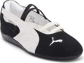 An extended topline bridged with bands of soft elastic brings a ballet-inspired silhouette to a racing sneaker that still maintains the low, streamlined profile that made it an icon. An aerodynamic Formstrip floating against the open side and a PUMA Cat embroidered on the toe keep the pedal to the floor for a fan-favorite win.