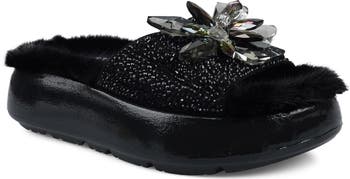 Dazzling crystals shimmer and shine atop the strap of an outfit-defining slide sandal set on a plush faux-fur footbed.
