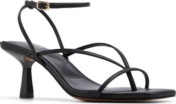 Slender straps underscore the minimalist profile of a square-toe sandal lofted by a sculptural flare heel for walkable height.